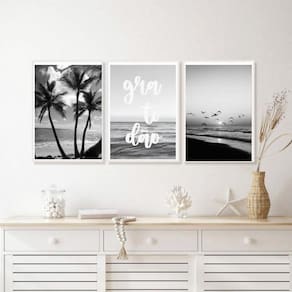Kit 3 quadros praia preto e branco gratidão 33x24cm - com vidro Moldura: madeira preta Informações do produto tire todas as suas dúvidas no descritivo abaixo: decoração para quarto, sala, cozinha, escritório, área gourmet e muito mais. Chega de paredes vazias medidas - cada peça tem 33x24cm a4 . Material do papel - papel fotográfico brilhante de altíssima resolução acabamento - todos os quadros são acompanhados de vidro para proteção da imagem. - moldura em madeira maciça na cor preta e pendurador . - os quadros são embalados de forma segura com plástico bolha com camada dupla de acordo com o tamanho dos quadros. Garantia - garantia de 3 meses. Meu quadro chegou. Como posso fixá-lo Você precisa apenas de um martelo e um prego, pois os quadros já vão acompanhados de penduradores. Esta é a forma mais indicada. Como posso limpar meu quadro A limpeza é feita como um móvel comum da sua casa. Apenas um pano seco ou espanador são suficientes para tal Ean: 7897235751738
