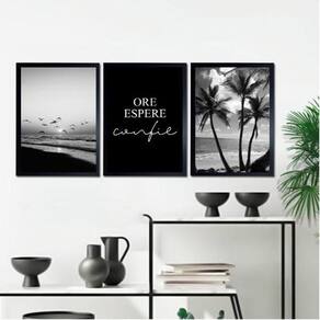 Kit 3 Quadros Praia Preto E Branco Ore Espere Confie 24X18Cm