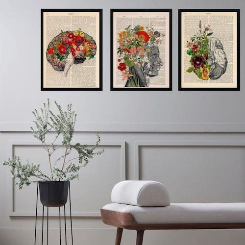 Kit 3 quadros psiquiatria cérebro flores 24x18cm - com vidro
