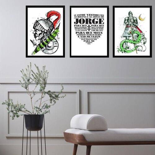 Kit 3 quadros são jorge espada oração 33x24cm Moldura: madeira branca Informações do produto tire todas as suas dúvidas no descritivo abaixo: decoração para quarto, sala, cozinha, escritório, área gourmet e muito mais. Chega de paredes vazias medidas - cada peça tem 33x24cm a4 . Material do papel - papel fotográfico brilhante de altíssima resolução acabamento - todos os quadros são acompanhados de uma película de acetato para proteção da imagem. - moldura em madeira maciça na cor preta ou branca conforme produto escolhido e pendurador móvel que pode ser retirado facilmente caso deseje fixar com fita dupla face. - os quadros são embalados de forma segura com plástico bolha com camada dupla de acordo com o tamanho dos quadros. Garantia - garantia de 3 meses. Meu quadro chegou. Como posso fixá-lo Você precisa apenas de um martelo e um prego, pois os quadros já vão acompanhados de penduradores. Esta é a forma mais indicada. Caso prefira, você pode utilizar uma fita dupla face neste caso, sugerimos de alta qualidade para evitar que descole e seu quadro caia . Como posso limpar meu quadro A limpeza é feita como um móvel comum da sua casa. Apenas um pano seco ou espanador são suficientes para tal