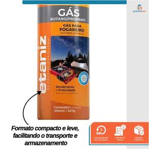 Características Principais: Composição: Mistura de butano e propano, gases altamente inflamáveis que garantem alta performance. Capacidade: 400ml, oferecendo um tempo de queima considerável para diversas refeições. Compatibilidade: Pode ser utilizado em diversos modelos de fogareiros portáteis, desde que sejam compatíveis com o tipo de válvula do refil. Praticidade: Formato compacto e leve, facilitando o transporte e armazenamento. Segurança: Quando utilizado corretamente, o gás Etaniz é seguro e confiável.