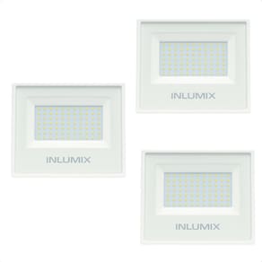 Kit 3 Refletor Holofote de Led 50W Branco Frio 6500K Branco Características Gerais do Produto: Benefícios do produto: Produzido com materiais de qualidade, economia de energia e design slim. Dimensões AxLxP CM : 11,5 X 13 X 2,5 Formato: Retangular Cor da luz: 6500K Frio Produzido em: Alumínio, Aço, Vidro e Componentes Eletrônicos Voltagem: Autovolt Utilizado em 110v e 220V Alimentação: Energia elétrica Cor acabamento: Branco Potência: 50W Fluxo luminoso: 4000 Lumens Eficiência luminosa: 80 Lm/W IRC: 80 Ângulo de abertura: 120 : 1 ano junto ao fabricante Aplicação: Externo Vida útil: 20.000 horas Acompanha lâmpada: Não necessita, LED já integrado Grau de proteção: IP65 Ajuste de intensidade Dimerizar : Não Acompanha o produto: 03 Refletor Led : 1 ano junto ao fabricante Marca: Inlumix