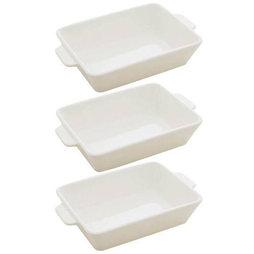 Garantia: 90 dias / Peso total: 2,886kg / Cor predominante: branco / Referência: 7794463674184; Dimensões de cada travessa: 28cm (C) x 17cm (L) x 5cm (A); Dimensões área de uso de cada: 24cm (C) x 16cm (L) x 4,8cm (A); Capacidade: 1 litro cada; Conteúdo: 3 assadeiras de porcelana; Material: porcelana.