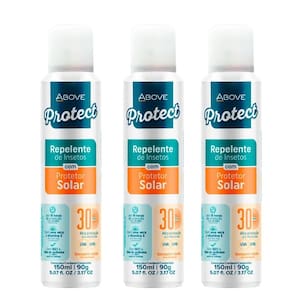Marca : above Produto : repelente de insetos com protetor solar Fator de proteção solar fps : fps30 Volume : 150ml Tipo de proteção : proteção contra insetos e proteção solar Benefícios : repelente de insetos e protege contra queimaduras solares Duração da proteção : proteção duradoura contra insetos e raios solares