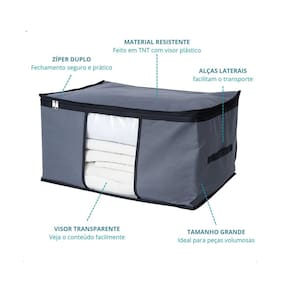 - Ideal para peças volumosas: edredons, cobertas King, Cobertor, casacos e muito mais. - Design compacto e fácil de armazenar. - Visor frontal transparente para fácil visualização do conteúdo. - Material resistente: TNT com plástico no visor. - Fechamento seguro com zíper duplo.