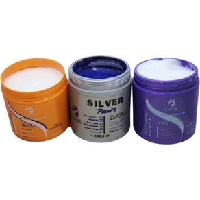 Contém 1 - selagem redutora ureia 500g cavier cosméticos 1 - selagem redutora uva 500g cavier cosméticos 1 - selante silver revit 500g cavier cosméticos Selagem redutora ureia Massa reparadora Aminoácidos + brilho - volume Toque sedoso - maciez & suavidade É um excelente produto que promove um liso duradouro indicado para todos os tipos de cabelos, compatível com qualquer tipo de química. O tratamento alisa, reconstrói profundamente a estrutura dos fios repõe a massa capilar perdida desemborracha os fios emborrachados. Possui ação anti frizz. Composta por aminoácidos, vitamina e, queratina hidrolisada e ureia que além de alisar, tratam os cabelos, deixando-os com um liso natural, macios, com muito brilho e hidratados. Não amarelam ou desbotam os fios. Modo de usar: após lavar cabelos, retire o excesso de água com auxilio de uma toalha e aplicar a selante redutora ureia cavier professional nos cabelos úmidos. Deixar agir por 10 minutos proceder com a técnica convencional da escovação e chapa. opcional enxague em seguida. === Selagem redutora uva Massa reparadora Aminoácidos + brilho - volume Toque sedoso - maciez & suavidade Composto por aminoácidos, vitaminas e queratina hidrolisada e oleo de semente de uva que além de alisar, tratam os cabelos. Deixando-os com um liso natural, macios, com muito brilho e hidratados. Não amarelam ou desbotam os fios. A selagem redutora uva cavier é um tratamento para recuperar as massas capilares danificadas selando as escamas do cabelo, acabando com o frizz e reduzindo o volume. O tratamento age deixando os cabelos, macios, emolientes, com brilho e hidratados, sendo sua aplicação rápida e mais eficiente que qualquer hidratação. Esse tratamento devolve aos fios a massa capilar perdida ao longo do envelhecimento dos fios e pelas agressões diárias como: sol, vento, chapinha , secador e outras químicas. Modo de usar: após lavar os cabelos com anti resíduos, retire o excesso da água com o auxilio de uma toalha e aplique a selagem redutora uva cavier nos cabelos úmidos, deixe agir por 10 minutos e proceder com a técnica convencional de escovação e chapinha. opcional . Enxague em seguida. === Selante silver revit - selagem matizadora Desamarelador - anti frizz Revitalizador - protege - realinha - liso natural - sedosidade - menos volume + brilho Reduz o volume, realinha os fios e acentua o loiro. Deixando matizado e com mais brilho. Composta por aminoácidos, vitaminas e queratina hidrólisada, e acid violet 43 que além de alisar tratam os cabelos, deixando-os com liso natural, maciez, com muito brilho e hidratados. Realinha proteje revitaliza. A máscara selante capilar - silver revit cavier professional é um tratamento para recuperar as massas capilares danificadas, selando as escamas do cabelo loiro, acabando com os frizz e reduzindo o volume. O tratamento age deixando os cabelos, macios, emoliente, com brilho e hidratados, realinha os fios e acentua o loiro. Modo de usar - após lavar os cabelos, retire excesso da água com auxilio de uma toalha e aplique a máscara selante capilar - silver revit cavier nos cabelos úmidos. Deixando agir por 10 minutos e proceder com a técnica convencional da escovação e chapa. opcional enxague em seguida.