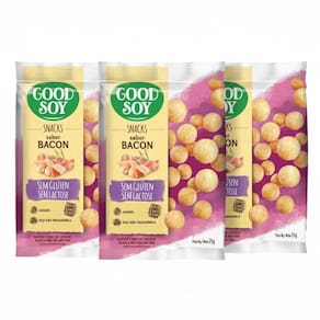 Kit 3 Snack Sabor Bacon 25g - GoodSoy - Grupo Rocha Saúde Sabor marcante, crocância irresistível e praticidade em um snack leve e assado, ideal para o dia a dia. O Snack Sabor Bacon 25g - GoodSoy é uma opção saborosa e prática para quem procura um lanche diferente, com o irresistível gosto de bacon e a leveza de um snack assado. Feito com proteína de soja e sem glúten, combina sabor e textura crocante na medida certa.