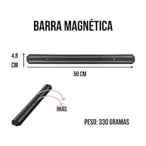 As dimensões da barra magnética são as seguintes: - Altura: 5 cm - Comprimento: 50 cm - Profundidade: 1,5 cm
