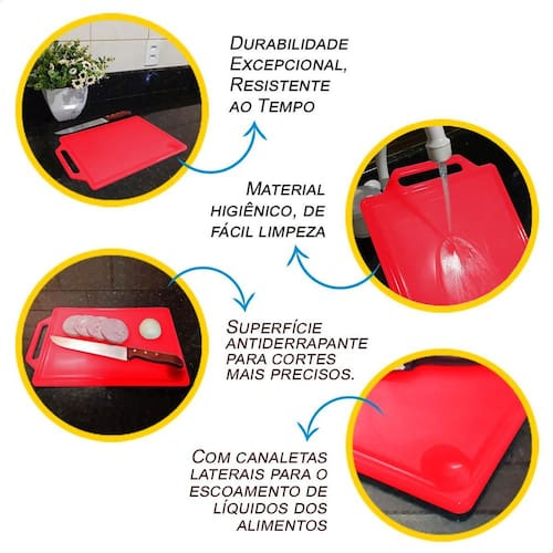 ESPECIFICAÇÕES TÉCNICAS: - Marca: Policorda; - Modelo: Tábua de Corte Premium Grande; - Material: Polietileno PE ; - Tamanho: 37,5 x 24,3 cm; - Espessura: 1 cm; - Cor: Branco, Preto e Vermelho - Características: Atóxico e inodoro; - Conteúdo: 3 Unidade da tábua de carne premium. Ean: 7796875700925