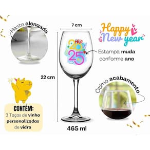 Especificações: Altura: 22 cm Diâmetro: 7 cm Capacidade: 465ml Material: Vidro Contém: 3 Taças De Vinho Personalizadas Ano Novo Marca: Não Informado Ean: 7891705044511