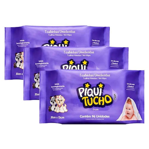 TOALHA UMEDECIDA PIQUITUCHO PRATIC 96 UNIDADES Com aloe Vera e vitamina E. As Toalhinhas umedecidas Piquitucho Pratic foram especialmente desenvolvidas para a higiene da pele delicada do bebê. Sua fórmula suave é enriquecida com Extrato de Aloe Vera e Vitamina E que hidratam e protegem a pele do bebê. São produzidas com tecnologia Spunlace que rende muito mais e são super macias. Utiliza menos folhas por troca de fraldas. Tratadas dermatologicamente. Ean: 7908032300873