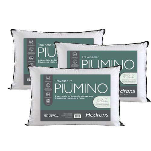DescriçãoKit 3 Travesseiros Hedrons Piumino Um Travesseiro Nobre, que reúne a capa em tecido de efeito maquinetado, as plumas de poliéster de toque suave no enchimento e a tecnologia Super Ball, de última geração que proporcionará o conforto do toque de plumas com um nível de suporte mais alto, tornando-se ideal para quem opta por um travesseiro mais firme.Desfrute da suavidade do toque de plumas num travesseiro mais alto e firme.Proteção e cuidadosGraças ao seu material hipoalergênico, você poderá dormir tranquilo e evitar alergias ou complicações de saúde. Este produto lhe dará ótima qualidade no seu relaxamento diário.CONTÉM:3 Travesseiros Hedrons Piumino Toque de PlumasMedida: 50cm x 70cmAltura: 17cmPosição de dormir: Indicado para quem dorme de ladoComposição: Tecido: 100% PoliésterEnchimento: 100% PoliésterCARACTERÍSTICAS EXTRAS:- Toque suave- Suporte firme- Lavável em máquina- Não alérgico-Exclusiva Tecnologia Super Ball*INSTRUÇÕES, AVISOS E CUIDADOS COM O PRODUTO:- Para lavar o travesseiro, coloque-o na máquina de lavar no ciclo delicado, com água fria.- Não use alvejante ou amaciante.- Deixe o travesseiro secar à sombra.