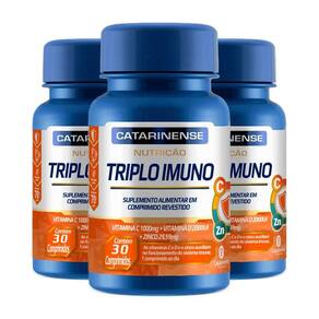 Kit 3 Triplo Imuno Catarinense 30 Comprimidos Triplo Imuno foi desenvolvido com base nas necessidades nutricionais específicas para indivíduos com 19 anos ou mais. Possui em sua formulação 3 nutrientes 2 vitaminas + 1 mineral : Vitamina C 1.000 mg + Vitamina D 2.000 UI + Zinco 29,59 mg. Finalidade do Uso Visão: o Zinco auxilia na visão. Imunidade: as vitaminas C e D e o zinco auxiliam no funcionamento do sistema imune. FERRO: A vitamina C auxilia na absorção de ferro dos alimentos. CABELOS, PELE E UNHAS: o zinco contribui para a manutenção do cabelo, da pele e das unhas. DIVISÃO E DIFERENCIAÇÃO: a vitamina D e o zinco auxiliam no processo de divisão celular. Energia: a vitamina C auxilia no metabolismo energético. Metabolismo: o zinco auxilia no metabolismo de proteínas, carboidratos e gorduras. A vitamina C auxilia no metabolismo de proteínas e gorduras. O zinco auxilia no metabolismo da vitamina A. Antioxidante: a vitamina C e o zinco são antioxidantes que auxiliam na proteção dos danos causados pelos radicais livres. A vitamina C auxilia na regeneração da forma reduzida da vitamina E. SÍNTESE DE PROTEÍNAS: o zinco auxilia na síntese de proteínas. FORMAÇÃO DO COLÁGENO: a vitamina C auxilia na formação do colágeno. OSSOS E DENTES: a vitamina D auxilia na formação de ossos e dentes. O zinco auxilia na manutenção de ossos. ATUAÇÃO MUSCULAR / MÚSCULOS: a vitamina D auxilia no funcionamento muscular. ABSORÇÃO E MANUTENÇÃO: a vitamina D auxilia na absorção de cálcio e fósforo. A vitamina D auxilia na manutenção de níveis de cálcio no sangue. Não contém Glúten, açucares e Lactose. Marca: Não Informado