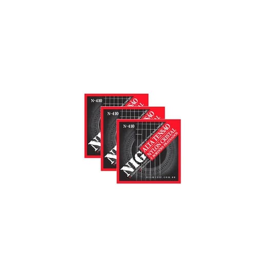 Especificações: - encordoamento para violão nylon nig tensão alta - modelo n-410 - primas: nylon cristal - bordões: prateados - cordas primas lisas monofilamento de nylon cristal - bordões encapados com bronze 80/15 sobre monofilamento de nylon - tensão das cordas: alta