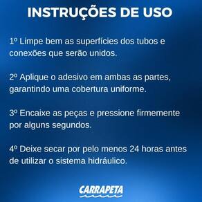 Instruções de uso: 1º limpe bem as superfícies dos tubos e conexões que serão unidos. 2º aplique o adesivo em ambas as partes, garantindo uma cobertura uniforme. 3º encaixe as peças e pressione firmemente por alguns segundos. 4º deixe secar por pelo menos 24 horas antes de utilizar o sistema hidráulico.