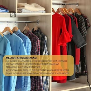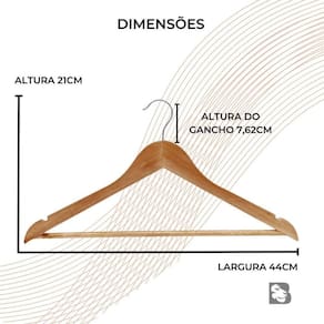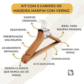 Kit 3 Unidades Cabides De Madeira Com Verniz Kit 3 Unidades Cabides De Madeira com Verniz Escolha perfeita para quem deseja organização, durabilidade e um toque de sofisticação no guarda-roupa. Fabricados em madeira resistente e revestidos com acabamento em verniz, esses cabides garantem elegância e proteção extra contra umidade, prolongando sua vida útil, com design robusto, cada cabide possui uma estrutura firme capaz de suportar diferentes tipos de roupas, desde peças leves como camisetas e blusas até trajes mais pesados como casacos e ternos. O formato anatômico ajuda a manter a forma das peças, evitando deformações nos ombros e garantindo um caimento perfeito ao vestir. O gancho metálico giratório permite maior praticidade ao pendurar e organizar as roupas, facilitando o manuseio no dia a dia. Além disso, os cabides contam com recortes laterais estratégicos para segurar vestidos, alças finas e outras peças delicadas, impedindo que deslizem e fiquem desorganizadas no armário, com acabamento envernizado, esses cabides não apenas garantem um visual sofisticado ao guarda-roupa, mas também evitam lascas e danos às roupas, tornando-se uma opção segura e durável. Ideal para quem busca funcionalidade aliada à elegância na organização do vestuário.