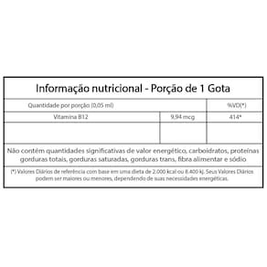 Cada porção de 0,5 ml 1 gota contém 2,4 mcg de Vitamina B12, correspondendo a 100% da necessidade diária recomendada.