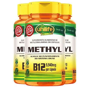 Kit 3 Suplemento Alimentar em Cápsula Vitamina B12 Metilcobalamina Unilife Vitamina de origem vegetal, produto vegano, sem origem animal A Vitamina B12, é fundamental para todos os músculos do nosso organismo, para o sistema nervoso e saúde do sangue. Essa vitamina não é produzida no nosso corpo e por isso deve ser ingerida na alimentação ou através de suplementação. A B12, também conhecida apenas como cobalamina, é apresentada de duas formas, como Cianocobalamina, que é uma forma sintética de B12 encontrada apenas nos suplementos e também como Metilcobalamina, que é uma forma natural obtida através de fontes vegetais e Utilizado em suplementos. Aqui na Relva você encontra as duas opções em cápsulas e escolhe a melhor para você. Para comprar a Cianocobalamina. Como é produzida por alguns microrganismos presentes em produtos de origem animal e poucos alimentos vegetais possuem essa vitamina, é extremamente importante que os vegetarianos e veganos acompanhem através de exames a suas necessidades de realizarem a suplementação. Como usar a Vitamina B12 em cápsulas Sugere-se a ingestão de 1 cápsula ao dia, após a refeição. Ingerir com líquido. Ingredientes Metilcobalamina e agente de massa: celulose microcristalina. Cápsula: gelatina vegetal, dióxido de titânio e água. Peso total da cápsula 350mg. Cada cápsula contém 9,94 mcg de Vitamina B12. Marca: Não Informado