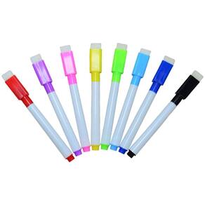 cor da tinta: preto todas as canetas possuem a tinta de cor preta, apenas as tampas são coloridas as cores das tampas são enviadas de acordo com a disponibilidade em estoque , na ponta da tampa encontra-se uma espuma para apagar e na lateral um ímã que permite que grudem em superfícies metálicas. Contém: 30 canetas para quadro branco 11x1cm com apagador e ímã na tampa