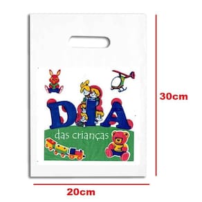 Kit 30 Sacolas Plástica 30X20 Para Dia Das Crianças Para Doces Contém: 30 unidades de sacolas plástica branca personalizada Tamanho aproximado: 30cm x 20cm Material: Plástico Ean: 7798633348363