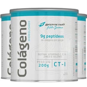 Kit 3Colágeno Hidrolisado Peptídeos Em Pó 200G Sabor NaturalConheça o novo colágeno ct-1 nutri science em pó da bodyaction. Com 9g de peptídeos de colágeno por dose, ele é 100% hidrolisado e fornece as proteínas e vitaminas necessárias para melhora da saúde dos cabelos, unhas e pele, além de prevenir o aparecimento de estrias e marcas de expressão. Contém as vitaminas c, e, a, zinco e selênio. Experimente o poder do novo colágeno bodyaction nutri science.O único com técnologia absorb®O colágeno hidrolisado ct-1 nutri science® é o único desenvolvido com a tecnologia absorb® onde ele é submetido à uma quebra de partículas 5x vezes menores, através de equipamentos micro-mesh de última geração. O resultado disso é uma absorção mais rápida e completa. Toda essa tecnologia foi desenvolvida pensando em você para que os resultados apareçam mais rápidos e com resultados nítidos.Com o colágeno ct-1 nutri science, você vai experimentar a sensação de uma pele mais jovem e um corpo mais firme. De pureza incomparável e com um alto teor proteico, o colágeno ct-1 é 100% hidrolisado, o que permite uma maior absorção.Colágeno é uma proteína que dá sustentação às fibras elásticas da pele e melhora a saúde das unhas, cabelos e articulações, e como deixa de ser produzido gradativamente a partir dos 30 anos, a suplementação se faz necessária para quem quer ter uma aparência mais jovem e com menos flacidez tecidual. Após os 50 anos formam-se apenas 35% do que é necessário, e esta falta pode ser notada pelo aparecimento de rugas, a redução da elasticidade da pele e fragilidade óssea.O colágeno é sintetizado com mais eficiência quando consumimos com vitamina c, vitamina e, zinco e selênio. O colágeno hidrolisado ct-1 da body action, contém 9g de colágeno hidrolisado puro, com apenas 35 calorias por porção e é enriquecido com as vitaminas e, a, c, zinco e selênio capazes de neutralizar os radicais livres que provocam danos celulares, acarretando a deterioração do colágeno.O colágeno hidrolisado possui micropartículas que são absorvidas com mais facilidade pelo nosso organismo.Apresentação: potes com 200 gSabores: abacaxi com hortelã | laranja com acerola | limão e clorofila | uva | naturalIngredientes: colágeno hidrolisado, vitamina a acetato de retinol , vitamina c ácido ascórbico , vitamina e dl alfa acetato de tocoferol , zinco sulfato de zinco monohidratado , selênio selenito de sódio , peptídeos de fécula hidrolisada, acidulante ácido cítrico, antiumectante dióxido de silício, edulcorante natural stevia.Modo de preparo: adicione 10g 2 scoops em 200ml 1 copo de água ou bebida de sua preferência e mexa até completa dissolução. Pode ser consumido quente ou frio. Não utilize água fervendo.Advertências: "consumir preferencialmente sob orientação nutricional e/ou médico". Não contém açúcares. Adoçado naturalmente com stévia dos andes.Conservação: mantenha fora do alcance de crianças. Manter em lugar fresco, não úmido e ao abrigo de luz. Não consumir o produto se o lacre de proteção estiver violado.