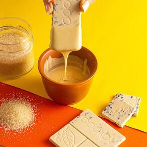 No chocolate branco com nibs vegano cookoa, o açúcar demerara traz a doçura necessária - na medida, é adicionado a metade do açúcar utilizado nos chocolates convencionais. E por fim, para trazer um contraste a toda cremosidade deste chocolate branco vegano, do bem e de verdade, foi adicionado pedacinhos do cacau fino, as famosas nibs