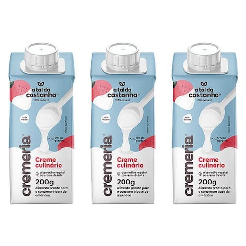 Kit 3x: creme culinário vegetal cremeria a tal da castanha 200ml O creme culinário vegetal cremeria a tal da castanha é uma alternativa vegetal ao creme de leite. É 100% natural, sem lactose e à base de amêndoa.