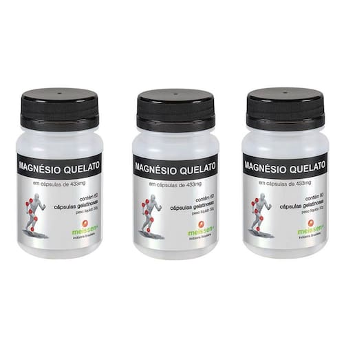 Constituído por 2 aminoácidos de Glicina Bisglicinato e 1 Magnésio, o Magnésio Quelato possui duas apresentações: Embalagens com 60 ou 120 cápsulas gelatinosas de 433mg. Cada cápsula gelatinosa de 433mg fornece 130mg de magnésio, o que corresponde a 50% da ingestão diária recomendada.