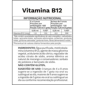 Vitamina B12 Metilcobalamina A vitamina B12 é importante para o bom funcionamento de diversos processos em nosso corpo, entre eles: mental, aparência, qualidade de vida, cuidados ao bem-estar geral entre variados benefícios presentes na vitamina B12, um nutriente que em sua forma natural oferece alto teor de metilcobalamina. Essa vitamina essencial é a chave para um corpo ativo e mente alerta. Benefícios: Apoio Energético; Benefício Mental; Otimiza o sistema de defesas naturais do corpo; Com benefícios a pele, cabelo e unhas atuando na aparência e a qualidade de vida; Pode atuar na estabilidade do humor; Pode promover uma sensação geral de bem-estar; Suplementação eficiente: a B12 vem na forma ativa, metilcobalamina, que é utilizada diretamente pelas vias sem necessidade de conversão. 100% Vegano: apropriado para quem segue dietas vegetarianas ou veganas. Sem adição de açúcar ou adoçantes: Não há adição de açúcar ou qualquer tipo de adoçante; Econômico e prático: as gotas podem ser consumidas em qualquer lugar, oferecendo um ótimo custo-benefício; Melhor absorção: a forma líquida favorece a absorção sublingual mais rápida. Fácil consumo: especialmente para idosos e crianças, ou para quem tem dificuldades de deglutição. Recomendação de uso: Crianças de 4 a 8 anos sugere-se a ingestão de 1 gota via oral ou sublingual ao dia, maiores de 9 anos sugere-se a ingestão de 5 gotas via oral ou sublingual ao dia o conforme recomendação . Marca: Não Informado Ean: 7794392753486