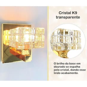 - Materiais: metal e cristal k9. - Dimensões do cristal CxLxA : 7 cm x 7 cm x 4,5 cm - Dimensões da base: Altura: 12 cm Largura: 10 cm Profundidade: 2cm - Profundidade total da arandela: 10,5 cm