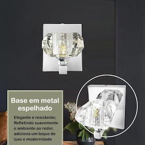 Descrição: - materiais: metal e cristal k9. - dimensões do cristal cxlxa : 7 cm x 7 cm x 4 cm - dimensões da base: Altura: 12 cm Largura: 10 cm Profundidade: 2 cm - profundidade total da arandela: 10 cm