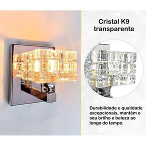 - materiais: metal e cristal k9. - dimensões do cristal cxlxa : 7 cm x 7 cm x 4,5 cm - dimensões da base: Altura: 12 cm Largura: 10 cm Profundidade: 2cm - profundidade total da arandela: 10,5 cm