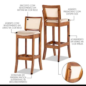 Se você está procurando uma banqueta que se destaque em todos os ambientes, precisa conhecer a Banqueta Portugal. Com um design moderno, ela vai se adequar perfeitamente as suas necessidades do dia a dia. A Banqueta Portugal é perfeita para ser utilizada em diversos espaços, como a bancada da cozinha americana, balcões altos em espaços gourmet, mesas bistrô no cantinho do churrasco e muito mais. Ela traz estilo e funcionalidade para qualquer ambiente em que for colocada. Produzida com materiais de excelente qualidade, a Banqueta Portugal garante maior durabilidade e resistência. Não perca mais tempo procurando a banqueta perfeita e venha conhecer nosso catálogo para deixar sua casa mais completa e cheia de estilo com todos os produtos da Rio Madeira Interiores. CARACTERÍSTICAS TÉCNICAS: - Produzido em Madeira Maciça Sustentável - Acabamento em Verniz na cor Imbuia - Encosto com Revestimento em Rattan com Fibra Sintética Quadriculada na cor Bege - Assento Estofado Preenchido com Espuma D23 - Assento com Revestimento em Linho Bege M58 - Banqueta Entregue Montada *Kit Composto por QUATRO Banquetas INFORMAÇÕES TÉCNICAS: Altura Total: 100 cm Altura Chão até Assento: 75 cm Altura Encosto: 29 cm Largura Total: 35,5 cm Largura do Assento: 41 cm Profundidade Total: 45,5 cm Profundidade Assento: 35 cm Peso: 7 kg INFORMAÇÕES ADICIONAIS: Garantia para defeitos de fabricação conforme Código de Defesa do Consumidor. - Produto em madeira maciça natural, podendo ocorrer variação no tom ou cor da madeira. - As imagens ambientadas são meramente ilustrativas e podem apresentar itens que não compõe o produto, as cores do produto podem variar de acordo com o monitor, a iluminação do ambiente ou sua percepção visual. - Limpeza: Deve ser feita com pano macio e seco ou levemente umedecido com água e sabão neutro. Não devem ser utilizados abrasivos.