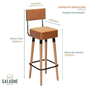 A banqueta Barcelona, possui 04 pés de madeira eucalipto com 60 cm de altura, e encosto estruturado, com seu design moderno, pode ser usada em sua área gourmet, área externa.