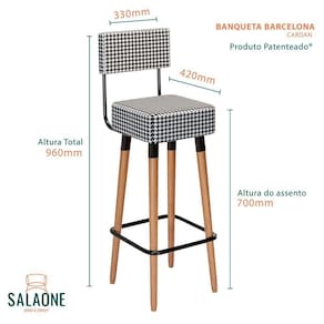 A banqueta Barcelona, possui 04 pés de madeira eucalipto com 60 cm de altura, e encosto estruturado, com seu design moderno, pode ser usada em sua área gourmet, área externa.