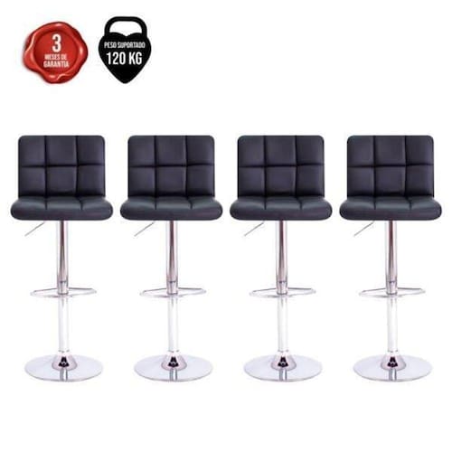 Kit 4 Banquetas Gomos Preta Bem Vindo a Cadeiras IncKit 4 Banquetas Alta Para Cozinha Gomos Giratória PretaAs Banquetas Gomos são uma ótima escolha para fazer parte de ambientes como cozinha, bar, balcão, bistrô entre outros locais. As Banquetas Gomos são ideais para quem está em busca de conforto e um design diferenciado.Um diferencial importante destas Banquetas é que elas são estofadas e revestidas, este material proporciona mais resistência, elegância e sofisticação à cadeira.Características técnicas da Banqueta Gomos:Altura total: Alta: 113cm / Baixa: 92cm Altura do chão até o assento: Alta: 84,5cm / Baixa: 63,5cm Largura: 45cm. Profundidade da banqueta: 48cm. Profundida do assento: 38cm.2- Qual o prazo de despacho R: Nós da Cadeiras Inc, priorizamos em despachar em até 24 horas úteis após a aprovação do pagamento.3- Elas vem desmontadas R: Elas vem pré montadas, basta fixar a base no assento, e ainda acompanha um manual de montagem, é bem simples.IMPORTANTE: Em regiões litorâneas, devido a salinidade no ar, não há garantia contra corrosão considerando-se como tal a região que distar até 50 km da costa marítima. Também não há garantia se a corrosão perfurante decorrer do uso indevido do produto. Observação: Pontos de amarelamento não são corrosão, mas apenas manchas que precedem o efeito corrosivo e surgem quando não há a devida manutenção do produto. Em condições normais, o amarelamento da superfície desaparece com uma simples limpeza realizada com pano e detergente neutro.