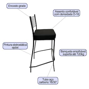 A banqueta 1629 é toda produzida em aço carbono tubo oblongo 16/30, sendo que no apoio para os pés consta o tubo 3/4. Seu encosto tem formato de uma grade para um melhor conforto. É revestida em pintura eletrostática epóxi na cor preta. Conta com assento em tecido linho na cor preto, sendo que seu assento (espessura 6cm) robusto e grosso é composto com espuma densidade D23.