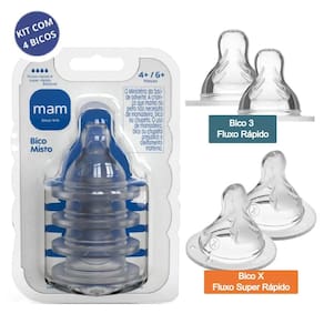 Kit com 4 bicos de silicone fluxo rápido e super rápido mam O bico 3 para mamadeiras mam proporciona um fluxo rápido enquanto o bico x possui um fluxo super rápido, sendo ideal para líquidos mais consistentes. Ao invés de um furo como o bico 3, o bico x possui a abertura em formato de x. Eles contam com uma superfície texturizada e sedosa, além do formato simétrico para um posicionamento correto durante o uso. Eles também possuem uma válvula lateral para auxiliar na redução da ingestão de ar durante a alimentação, que, é o causador de desconfortos abdominais nos bebês, proporcionando um fluxo contínuo e adequado do alimento. Os bicos são totalmente livres de bpa/bps e são compatíveis com todas as mamadeiras mam e com o copo trainer+. O ministério da saúde adverte: a criança que mama no peito não necessita de mamadeira, bico ou chupeta. O uso de mamadeira, bico ou chupeta, prejudica o aleitamento materno. Principais características: - tamanho dos bicos: 3 4m+ e x 6m+ - bico 3: proporciona um fluxo rápido - bico x: proporciona um fluxo super rápido - o bico x é ideal para líquidos mais consistentes ou engrossados - abertura do bico em formato de x - bicos em silicone texturizado e sedoso - possuem formato simétrico para um posicionamento correto durante o uso - possuem válvula para redução da ingestão de ar - a válvula permite um fluxo contínuo do alimento - livres de bpa e bps Especificações técnicas: - conteúdo da embalagem: kit com 2 bicos 3 fluxo rápido 4m+ e 2 bicos x fluxo super rápido 6m+ mam - composição/material: silicone - peso: 0,040kgs - garantia: 30 dias contra defeitos de fabricação pelo fabricante - certificação: ce-pur/iqb 000153 nbr 13793 - ocp 006 - código do fabricante: bi00640 - ean: 9001616853432 - marca: mam Imagens meramente ilustrativas. As cores e estampas podem variar de acordo com o lote do fabricante.
