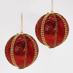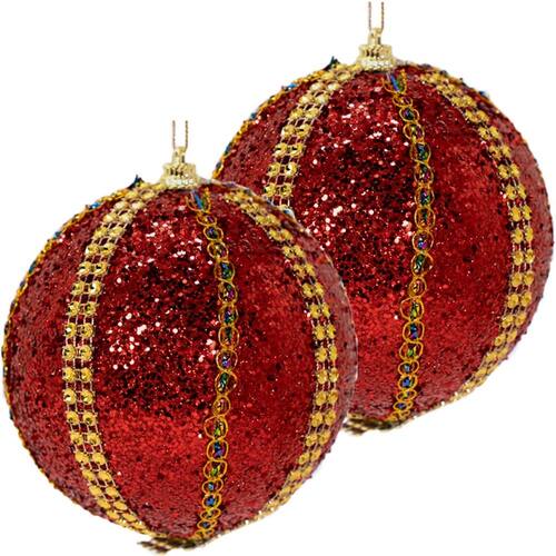 2 Kit Com 2 Bolas Para Árvore De Natal Vermelha Com Glitter Dourado 85mm;