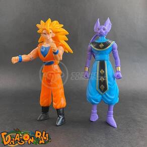 Conteúdo: Bonecos Goku Super Sayajin 14cm, Bills 14cm, Zamasu 14cm, Senlong 9cm, Majin boo 10cm + 4 Esféras do dragão