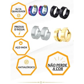 Kit 4 brinco argola lisa 10mm unissex furta cor preto prata dourado preto aço inox Kit 4 brinco argola lisa 10mm unissex furta cor preto prata dourado preto aço inox Kit completo argolas cores preto, prata, dourado e furta cor unissex é uma ótima opção para presentear um amigo ou namorado. Brinco em aço inox, não descasca e não enferruja, podendo usar diariamente. ========================================================= Fotos reais do produto na galeria Modelo a prova d'água, podendo usar em piscinas e praias, não descasca, não escurece, não perde a cor Detalhes técnicos: Marca: visujóias Modelo: brinco argola masculina Diâmetro: 10mm Espessura do brinco: 4mm Incluso: 4 pares do brinco argola Material: aço inoxidável. : a tem prazo de 6 meses. Todas as peças possuem tratamento antialérgico. =============================================================================== P:minha compra é segura R:toda compra que é feita aqui está em ambiente seguro, isso significa que se caso ocorra algum imprevisto faremos o estorno de seu pagamento. R: sim. P: produto é a prova d'água R: sim, pode usar em piscinas e praias que não escurece. P: tem R: sim, todos os nossos produtos tem de 6 meses, contra defeitos de fabricação. Todas as informações de cuidados são enviados junto com o produto. P: posta em quanto tempo P: posso trocar se não servir R: sim, enviamos nosso contato junto com o produto para orientação sobre troca. P: posso devolver se não gostar R: sim, caso não goste do produto é só entrar em contato conosco que iremos orientá-lo como efetuar a devolução. Dúvidas Pergunte à vontade, estamos aqui. ficaremos felizes em responder rapidamente. Aguardamos sua compra e estamos ao seu dispor : Marca: Não Informado Ean: 7732647212449