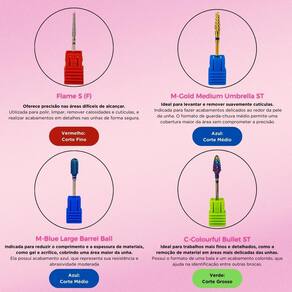 Características principais: - cortes estar finos, finos, médio e grosso; - kit com 4unidades; - modelo flame s f 720; - modelo m-gold medium umbrella:; - modelo c colourful bullet st; - modelo m blue large barrel ball st; - ideal para todas as áreas e processos; - não danifica as unhas naturais; - perfeita para alongamentos de unhas, e acabamentos; - garante precisão; - acabamentos detalhados.
