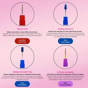 F Flame S(F) 720: Formato de chama e corte fino é ideal para remover gel próximo à cutícula sem agredir a unha natural. Oferece precisão e controle, sendo ótima para trabalhos de refinamento e para limpar áreas de difícil acesso.? M-Blue Smooth Top: Broca de corte médio com acabamento azul tem um topo arredondado (smooth top), entrega segurança adicional ao trabalhar próximo à pele. Sendo ideal para reduzir o comprimento e a espessura de materiais como gel ou acrílico, sendo usada principalmente para modelagem e desbaste sem risco de cortes ou arranhões na área ao redor da unha.? M-Gold Umbrella: Broca com formato de guarda-chuva e acabamento dourado, que indica resistência e durabilidade. Esse formato de guarda-chuva permite levantar e remover suavemente cutículas, além de fazer acabamentos ao redor da pele da unha. Sua abrasividade média é ideal para um trabalho de preparação eficiente e seguro, proporcionando precisão ao desbastar áreas delicadas sem agredir a pele ao redor.