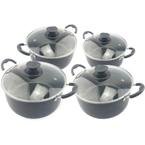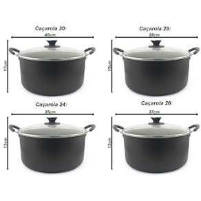 IMAGENS ILUSTRATIVAS Características: A Caçarola Grande Família é feita de alumínio reforçado, conferindo maior resistência ao produto. Conta com revestimento interno e externo de 5 camadas de antiaderente. A tampa de vidro possui furo para a liberação de vapor. As alças e o pomel são fabricados em baquelite antitérmico. Estas Caçarolas são fáceis de usar e limpar proporcionando maior praticidade e tempo na hora de preparar suas refeições. Especificações: - Tampa de Vidro - Anti Aderente - Alças Baquelite - Caçarola 30,28,26,24 - Alumínio Peso e Medida: 30: - Peso: 1,378 - Altura: 17 cm - Diâmetro: 30 cm - Largura: 40 cm 28: - Peso: 1,234 - Altura: 15 cm - Diâmetro: 28 cm - Largura: 38 cm 26: - Peso: 1,234 - Altura: 15 cm - Diâmetro: 26 cm - Largura: 35 cm 24: - Peso: 1,068 - Altura: 11 cm - Diâmetro: 24 cm - Largura: 33 cm Itens Inclusos: - 01 Panela Caçarola 24 cm - 01 Panela Caçarola 26 cm - 01 Panela Caçarola 28 cm - 01 Panela Caçarola 30 cm - 04 Tampa de Vidro