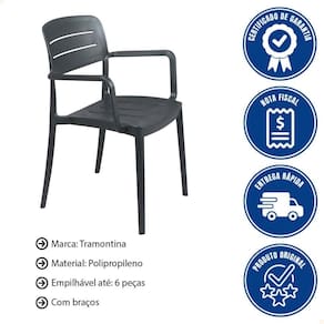 - Tenha conforto e resistência com a cadeira Tramontina Amélia em polipropileno grafite com braços.