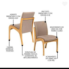 O Kit de Cadeiras Lisboa vai se tornar o protagonista no seu ambiente. Dispõe de um design atual, petindo montar diversas composições e agregar na decoração e conforto. Podem ser utilizadas em mesas de jantar, apoio extra na sala de estar, complementar ambientes ou onde você precisar. A Cadeira Lisboa é produzida com materiais de excelente qualidade, garantindo sua durabilidade e vida útil. CARACTERÍSTICAS TÉCNICAS: - Produzida em Madeira Maciça - Acabamento em Verniz na cor Mel - Assento Estofado Preenchido com Espuma D23 - Encosto Estofado Preenchido com Espuma D18 - Revestimento em Tecido Linho na cor Marrom Claro L87 - Cadeira Entregue Montada INFORMAÇÕES TÉCNICAS: Altura Total: 90 cm Altura Chão + Assento: 50 cm Altura Encosto: 44 cm Largura Total: 52 cm Largura Assento: 60 cm Profundidade Total: 60 cm Profundidade Assento: 56 cm Peso: 8 kg *Kit Composto por 4 Cadeiras Lisboa INFORMAÇÕES ADICIONAIS: Garantia para defeitos de fabricação conforme Código de Defesa do Consumidor. *Não nos responsabilizamos por subir ou içar o produto. **As imagens ambientadas são meramente ilustrativas e podem apresentar itens que não compõe o produto, as cores do produto podem variar de acordo com o monitor, a iluminação do ambiente ou sua percepção visual. ***Limpeza: Deve ser feita com pano macio e seco ou levemente umedecido com água e sabão neutro. Não devem ser utilizados abrasivos. Marca: Império das Banquetas