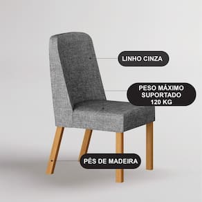 A sala de jantar é o cenário de memórias inesquecíveis, e o Kit com 4 Cadeiras de Jantar Isis foi desenhado justamente para elevar esses momentos. Com um visual sofisticado em Linho e pés em madeira, este conjunto não é apenas um item de mobiliário; é o upgrade de estilo e bem-estar que você e sua família merecem. Acabamento da Estrutura: Pintura UV Almofada do assento: Fixa Ambiente Principal: Sala de Jantar codigo_ean: 7900288331854 Complexidade da Montagem: Baixa: pode ser montado por uma pessoa sozinha Cor: Cinamomo/Cinza Cor do Produto: Cinamomo/Cinza Cor dos Pés: Marrom Dobrável: Não Enchimento do Assento: Espuma D-20 Enchimento do Encosto: Espuma D-18 Escala de Brilho: Fosco Estrutura do Assento: MDF Giratória: Não Itens Inclusos: 4 Cadeiras, Kit Ferragem e Manual de Montagem Linha ou Coleção: Isis Manual de Montagem e Instalação: https://product-hub-prd.madeiramadeira.com.br/416749470/documents/c68b52e5-e65b-456c-92cb-7d74e73ef419972cd279e9b0a22c1770819059.pdf Marca: Leifer Material da Base: Madeira Material dos Pés: Eucalipto Material Principal: Madeira Maciça Necessita Montagem: Sim Origem do Produto: Nacional Peso: 8,25 kg Possui Apoio para Braços: Não Possui Apoio Para os Pés: Não Possui Assento/Encosto Estofados: Possui Encosto e Assento Estofados Quantidade de Itens: 4 Recomendações de Uso, Manutenção e Limpeza: Utilize um pano umidecido, quase seco. Revestimento do Assento: Linho Revestimento do Encosto: Linho Sistema de Montagem: Parafusos, Cantoneiras e Sapatas Tamanho do Produto: 90x44x55,5 Tipo de Assento: Fixo Tipo de Encosto: Fixo Tipo de Madeira Maciça: Eucalipto