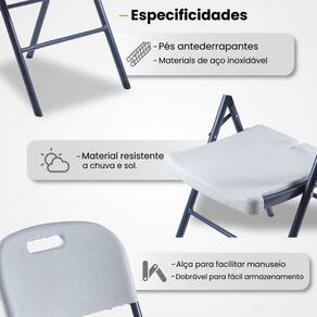 Caracteristicas Tecnicas: Cadeira dobravel Estrutura em aco Tonalidade: Branca Ponteira antiderrapante Peso maximo suportado: 230 kg