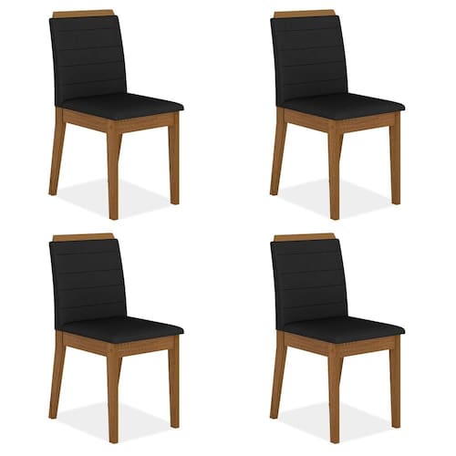 Detalhes Técnicos das Cadeiras: -Acabamento da Cadeira: Assento e Encosto Tapeçados -Almofada do Assento: Fixa -Cadeira Estofada: Sim -Peso Suportado da Cadeira: 90KG -Facilidade da Montagem: Média -Tonalidade da estrutura da Cadeira: Freijó -Tonalidade do Tecido: Suede Preto - Assento: D16 -Encosto: D14 -Tipo de Pintura: UV Texturizada -Material da Estrutura: MDF 25mm e 18mm -Medida da Cadeira: 95CM x 44CM x 50CM