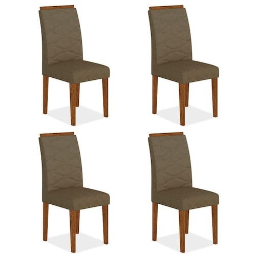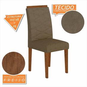 Detalhes Técnicos das Cadeiras: - Acabamento da Cadeira: Assento e Encosto Tapeçados - Almofada do Assento: Fixa - Cadeira Estofada: Sim - Peso Suportado da Cadeira: 90 KG - Facilidade da Montagem: Medial - Tonalidade da Cadeira: Freijó - Tonalidade do Tecido: Suede Capuccino - Assento: D16 - Encosto: D14 - Tipo de Pintura: UV Texturizada - Material da Estrutura: MDF 25mm e 18mm - Medida da Cadeira: 100CM x 44CM x 50CM